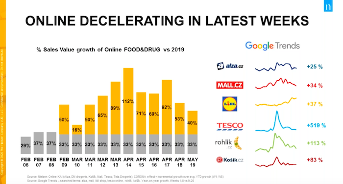 Výrazný nárůst byl vidět u online prodejního kanálu. Zatímco před nástupem pandemie se růst internetových supermarketů pohyboval mezi 29 až 37 %, za nouzového stavu rostl až trojciferně.