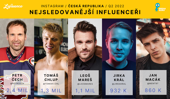 Co se týče celkově nejsledovanějších českých mužských influencerů na Instagramu, na prvním místě se stále drží fotbalista Petr Čech (2,4 milionu sledujících), kterému za poslední kvartál stouplo publikum o 200 tisíc sledujících. Z pětice nejsledovanějších influencerů naopak vypadl bývalý politik Dominik Feri. Publikum mu neustále klesá, a tak jeho místo nahradil čtyřiadvacetiletý Jan Macák alias MenT (860 tisíc sledujících), který se v letošním roce umístil v prestižním žebříčku 30 pod 30 časopisu Forbes. Bez významnějšího nárůstku zůstává publikum CrossFit sportovce Tomáše Chlupa (1,3 milionu sledujících), moderátora Leoše Mareše (1,1 milionu sledujících) i influencera Jirky Krále (932 tisíc sledujících).