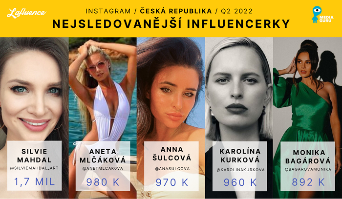 U českých influencerek proběhla v žebříčku také menší změna. Třetí a čtvrté místo se totiž vystřídalo – blogerka Anna Šulcová (970 tisíc sledujících) předběhla modelku Karolínu Kurkovou (960 tisíc sledujících), která je tak nyní na rozdíl od minulého kvartálu až na 4. místě. Pětici ovšem stále vévodí malířka Silvie Mahdal, kterou sleduje přes 1,7 sledujících z celého světa, a je tak možné, že v tomto kvartálu překoná na Instagramu jako první česká influencerka magickou hranici 2 milionů sledujících. Na pátém místě se drží zpěvačka Monika Bagárová.